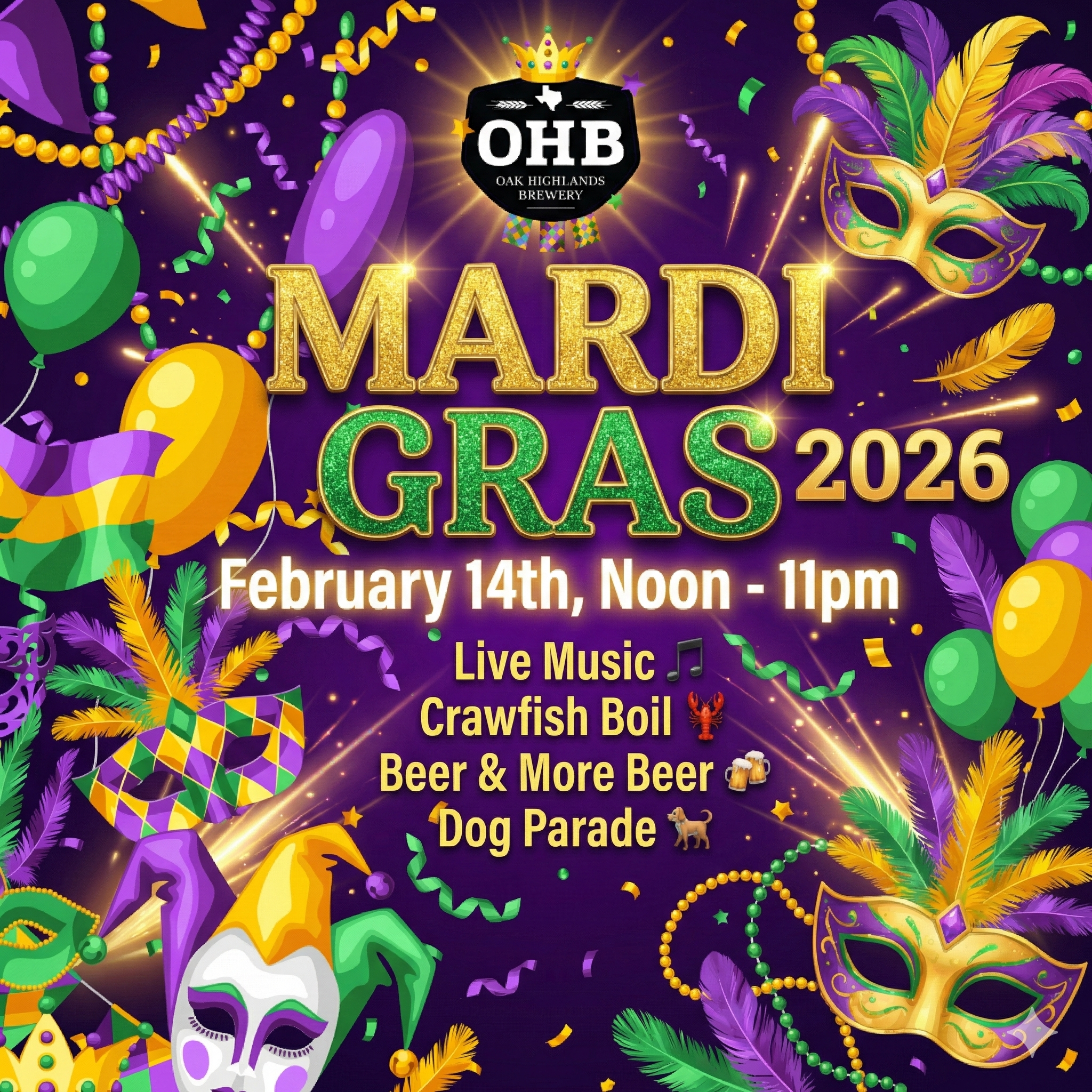Krewe of Barkus Dog Parade (The cutest date you’ll see all day)Whether you’re bringing a date, flying solo, or just here for the dogs, celebrate Mardi Gras the OHB way. Expect cold pours, hot bugs, and a few surprises brewing in the background!