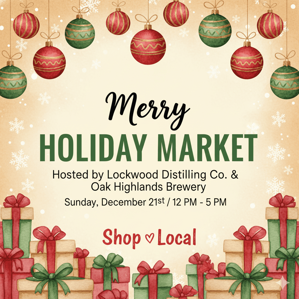Shop local at OHB and Lockwood Distilling on Sunday, December 21st from noon to 5 pm for a Holiday Market Pop-Up.