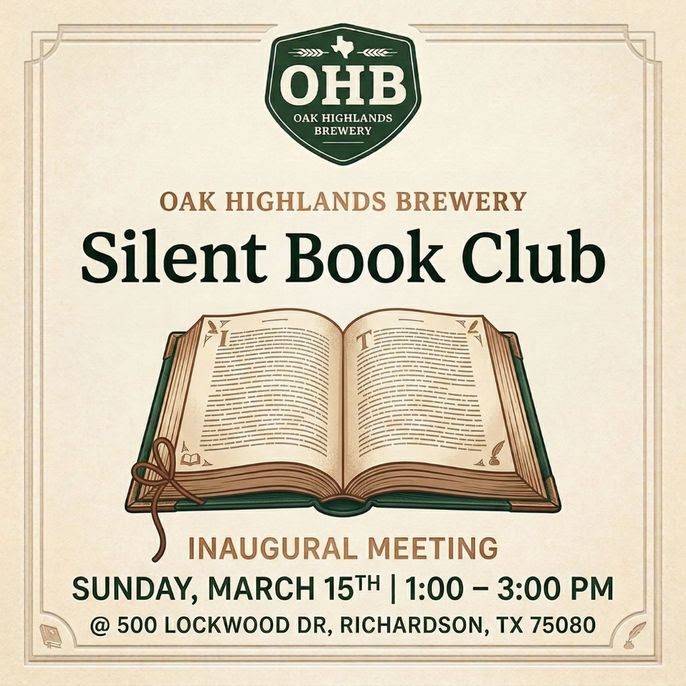 Introducing Silent Book Club! Read what you want. No pressure. No homework. Just quiet reading time in good company. Join us for our inaugural meetup! Sunday, March 15th 1 PM – 3 PM at Oak Highlands Brewery. Bring your current read, grab a drink, and enjoy some companionable silence. See you there!