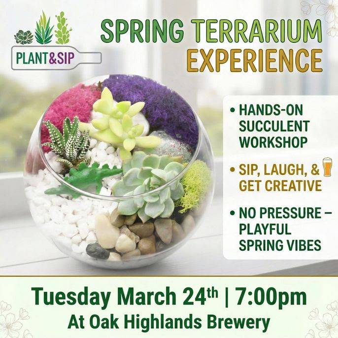 Welcome spring with our hands-on Terrarium Experience! Sip your favorite drink, socialize, and get creative as you build your own custom succulent terrarium. It’s the perfect blend of crafting, connection, and new beginnings. Join us and plant something beautiful!